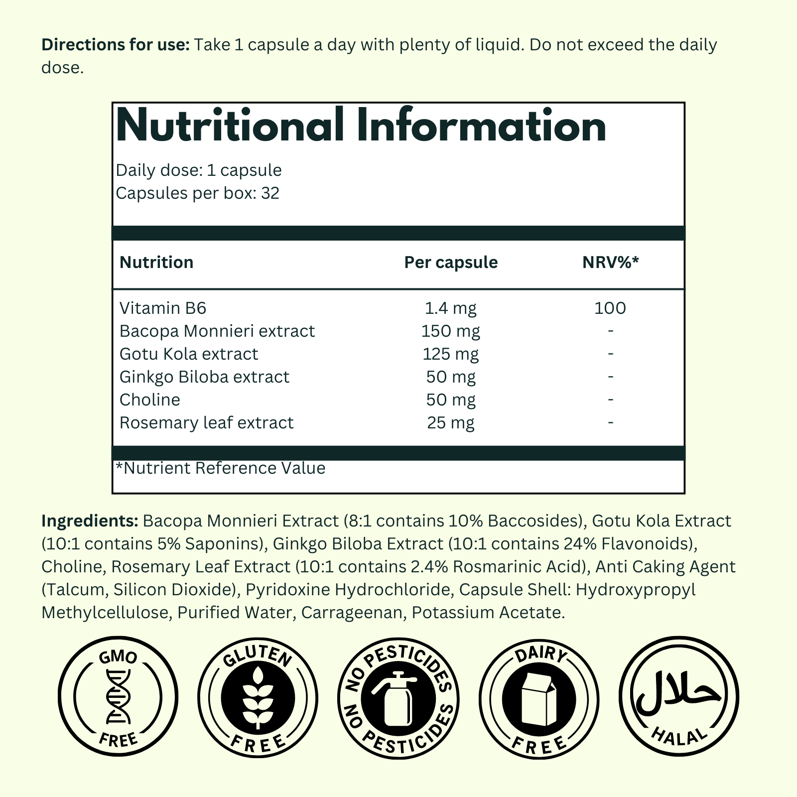 Bacopa Monnieri Extract (8:1 contains 10% Baccosides), Gotu Kola Extract (10:1 contains 5% Saponins), Ginkgo Biloba Extract (10:1 contains 24% Flavonoids), Choline, Rosemary Leaf Extract (10:1 contains 2.4% Rosmarinic Acid), Anti Caking Agent (Talcum, Silicon Dioxide), Pyridoxine Hydrochloride, Capsule Shell: Hydroxypropyl Methylcellulose, Purified Water, Carrageenan, Potassium Acetate.