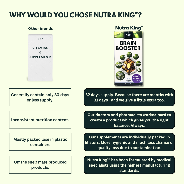 Whether you are climbing the corporate ladder, earning your degree, focused on athletics, or a mom-on-the-go, BRAIN BOOSTER by NutraKing™ may help to put your brain in a higher gear. A probable step up in focus and clarity, without the caffeine or stimulants, meaning no afternoon crash. You might feel energized from morning till night.