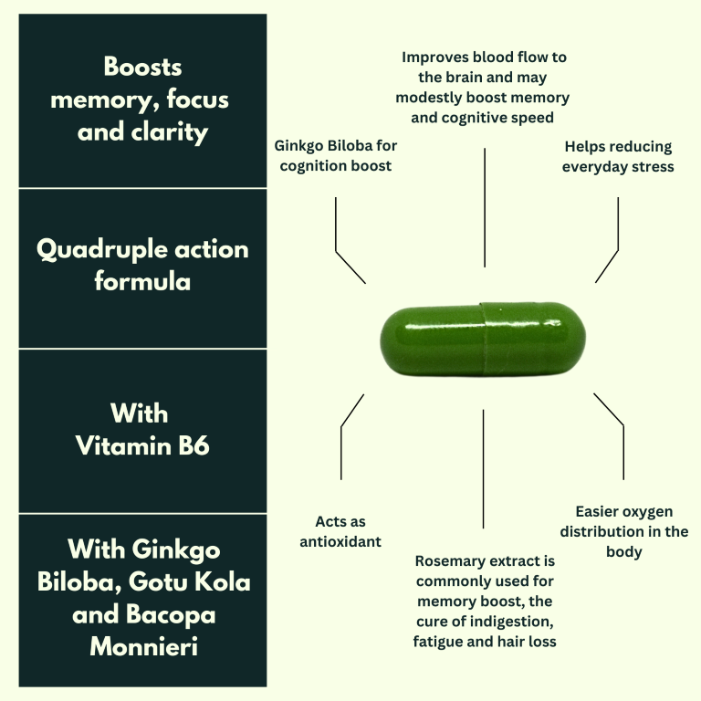 The active all-natural ingredients include Bacopa Monnieri and Ginkgo Biloba which may help with the maintenance of cognitive functions and memory. Gotu Kola may support peripheral circulation, and Rosemary may contribute to better digestion.