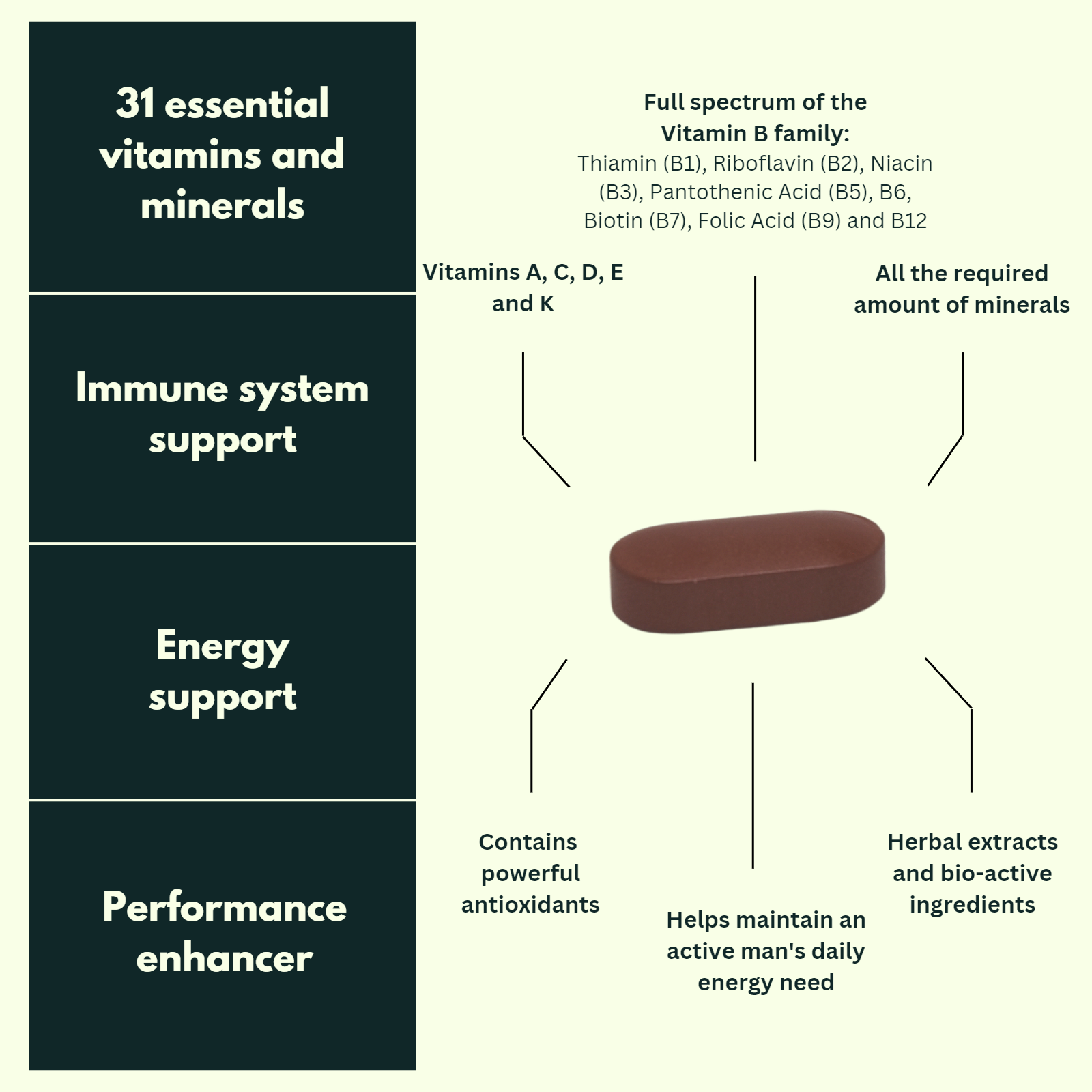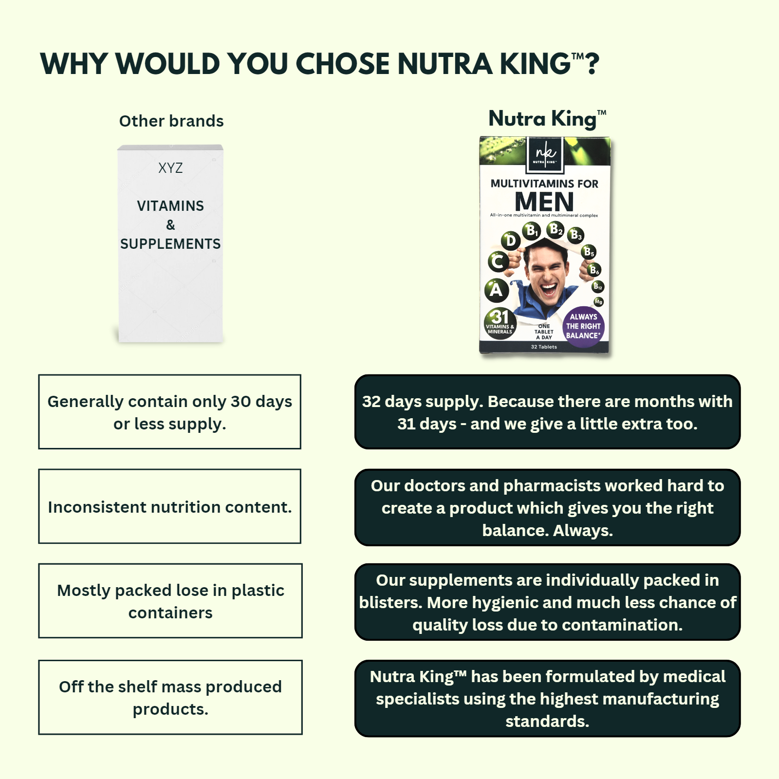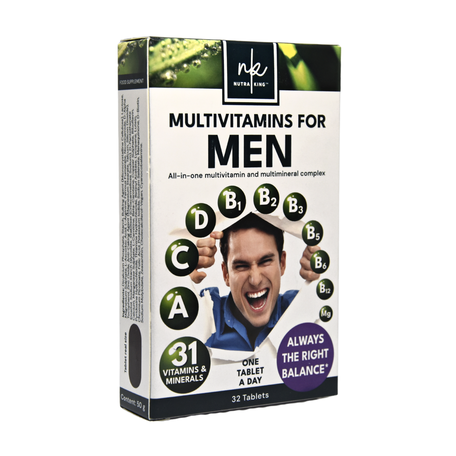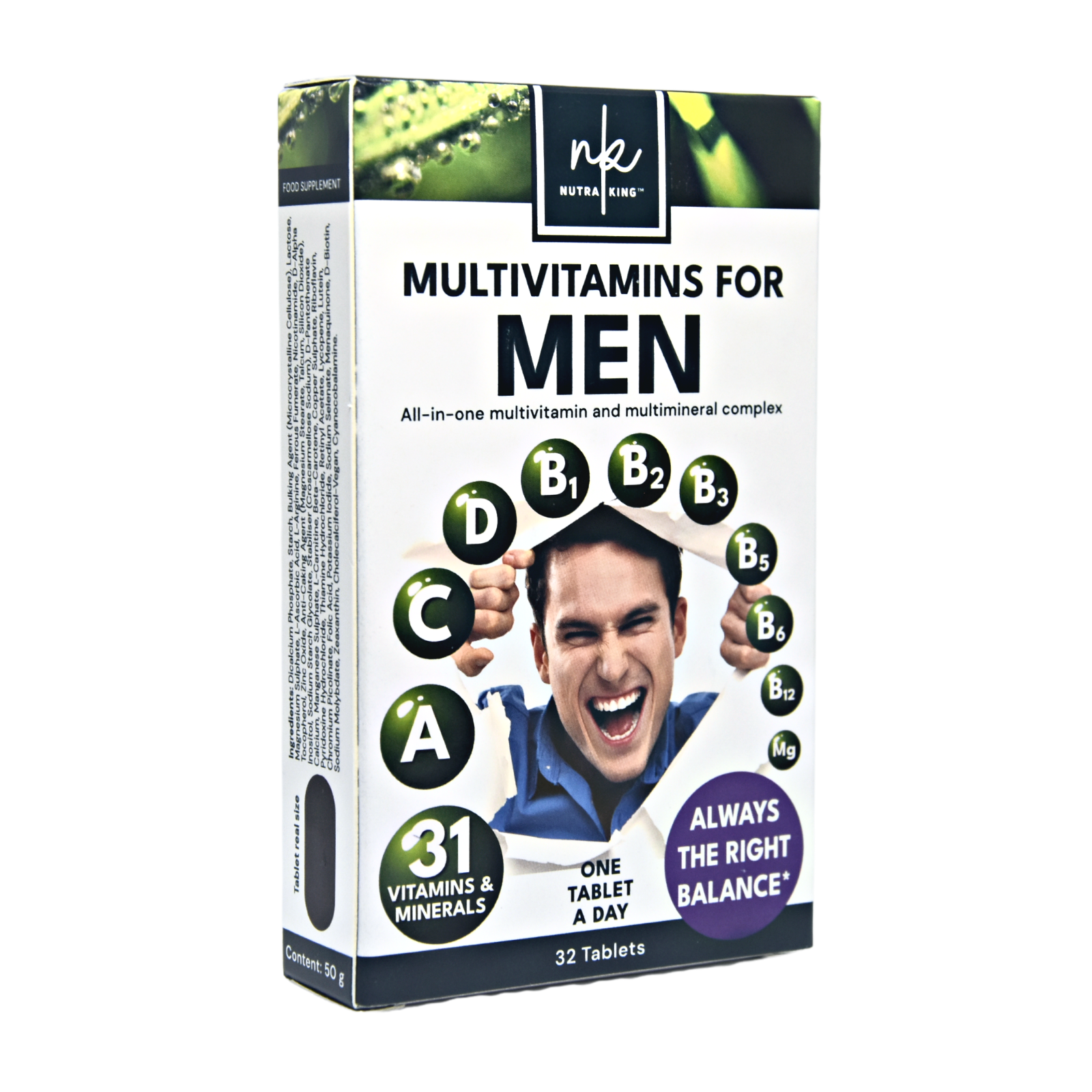 A high-potency daily multivitamin complex for men featuring optimal levels of 31 essential vitamins, minerals and bio-active ingredients. MULTIVITAMINS FOR MEN by NutraKing™ specially designed to meet the health needs of men, this formula provides beneficial nutrients.