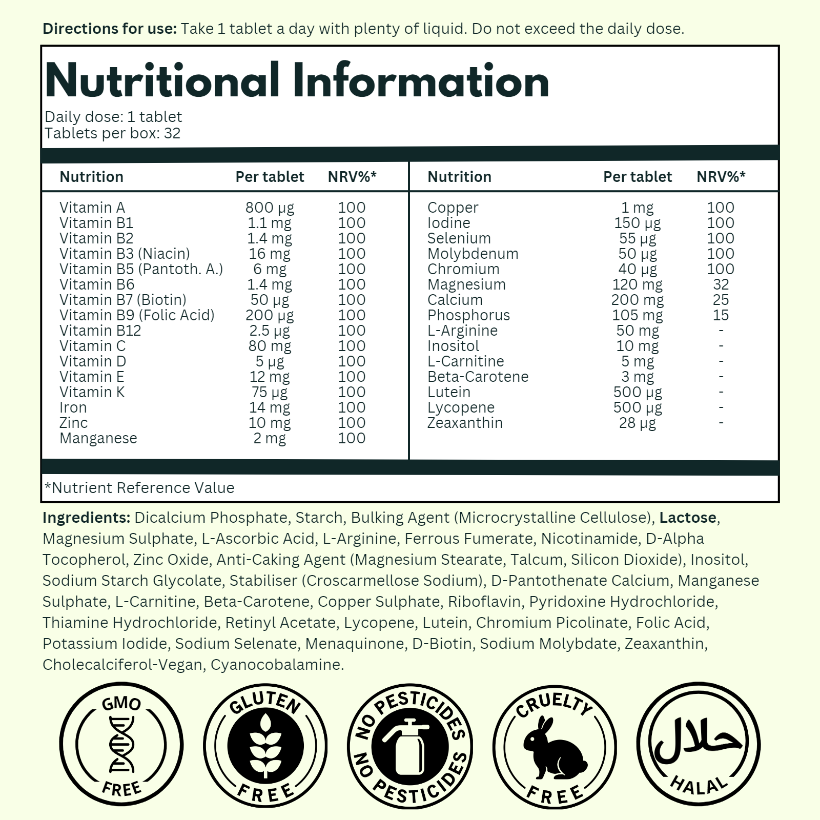 Dicalcium Phosphate, Starch, Bulking Agent (Microcrystalline Cellulose), Lactose, Magnesium Sulphate, L-Ascorbic Acid, L-Arginine, Ferrous Fumerate, Nicotinamide, D-Alpha Tocopherol, Zinc Oxide, Anti-Caking Agent (Magnesium Stearate, Talcum, Silicon Dioxide), Inositol, Sodium Starch Glycolate, Stabiliser (Croscarmellose Sodium), D-Pantothenate Calcium, Manganese Sulphate, L-Carnitine, Beta-Carotene, Copper Sulphate, Riboflavin, Pyridoxine Hydrochloride, Thiamine Hydrochloride, Retinyl Acetate, Lycopene, Lutein, Chromium Picolinate, Folic Acid, Potassium Iodide, Sodium Selenate, Menaquinone, D-Biotin, Sodium Molybdate, Zeaxanthin, Cholecalciferol-Vegan, Cyanocobalamine.