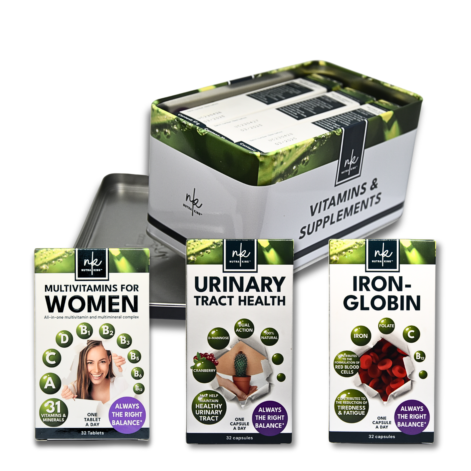 SUMMER PACK FOR WOMEN by NutraKing™ is our unique 3 in 1 pack of your essential summer vitamins. The compact tin box contains one month supply of the essential supplements to safeguard your body and stay energised in the months of Spring and Summer.